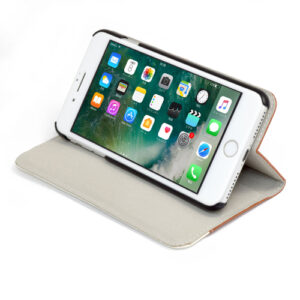 高級感あるレザータッチ素材 しっかりとした縫製\n本製品は、高級感あるレザータッチ素材をしっかりと縫製したブックタイプケースです。ケースは人気の[bi-color(バイカラー)デザイン]で、ホワイトのストライプと4色のベースカラーからお選びいただけます。\n\niPhoneをしっかりガード フリップカバーとハードフレーム\niPhoneをケースに固定するフレームは厚さ約1mmのポリカーボネイト素材を採用し、iPhoneが外れないようにしっかりと固定します。また、フリップカバー部分は最大2mmの厚みがあり、iPhoneの液晶画面を傷や衝撃から守ります。\n\nカードホルダー搭載 取り出しやすいV字スリット\n本製品のフリップ部分には、カードを1枚収納するっことができるスリットがあり、V字型のデザインによりカードの出し入れを簡単に行うことができます。また、緊急時の名刺入れとしてもご活用いただけます。\n\n動画視聴もラクラク 横置きスタンド機能\n本製品のフリップを折り畳むと、iPhoneを横置きにできるスタンドになります。家族や友人との写真やムービーを一緒に楽しむもことや、YouTubeや映画などをみる際に最適です。\n\nカバーの開閉がラクラク 開きやすく、持ちやすい設計\n本製品のカバーは、マグネットタイプなのでカバーの開閉がとても便利です。カバーを閉めるとピタッと閉じるので、液晶画面を傷や衝撃から守ることができます。また、カバーを開いた時、ケースの背面にカバーがピタッと貼り付き固定することができます。開きやすく、持ちやすい設計となっております。
