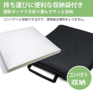 ・高輝度LEDライト×2本搭載、合計LED60灯搭載 ボックスで光を拡散させ、影を薄くして明暗差を減らし、被写体の色や形を正確に表現します。 ・マルチアングル 撮影ボックスの上部から垂直撮影できます。 ・取り換えスクリーン 被写体に合わせて背景色を取り換えることができます。 ・持ち運びに便利な収納袋付き 利用しないときは撮影ボックスを折畳みコンパクトに収納できます。 仕様: ●サイズ: 310×305×335cm ●重量: 730g ●電源: USB 5V ●付属品: 収納袋、背景布 黒/白/青/緑 各1枚、USBケーブル ●保証期間: 初期不良のみ ●生産国: 中国 ●パッケージサイズ: 500×400×60mm