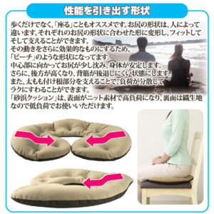 ●踏んだところが動く、止まるの不思議な感覚●とにかく気持ち良く、ザク・ザクと砂の音が心地良い 「砂浜を歩いてみませんか?」なんて言われても、わざわざ海まで行けませんよね。昔も今も、砂浜を裸足で歩いたりするのは気持ち良く、とても身体にイイのはわかっていますが、日常生活では体感することは難しいことです。日本の中でも、美しい砂浜として人気のある伊豆諸島にある新島は、東京から約160km離れた人口約2500人の、のんびりとした島です。この美しい浜の砂である軽石「抗火石」を、特殊な加工を施して使用してます。この加工された砂と、クロロプレンラバーを混ぜることで、クッションにした時でも、砂浜のような感覚を再現してます。クッションの上を、踏み込んでみてください。まるで砂浜のような気持ちの良い感触が伝わってきます。砂浜は、単に気持ちが良いだけではなく、足裏の形状に合わせて変形しで、その形状で「止まる」のです。この動きは、低反発素材などのクッションでは、不可能なことで、真似は一切できません。足裏を、そして土踏まずを細かな砂の粒子が刺激となって伝わります。足裏に適度な負荷もかかりエクササイズとしても有効ですが、膝や関節への負担は少なくなります。人間は本来、裸足で土の上を歩いて進化してきた動物で、足裏の形状は、その進化の過程で形成されたものです。アスファルトやフローリングなど、形状変化の無い硬い面を歩くと、本来の足の動きが発揮できないだけでなく、膝や関節への負担もあることもわかってます。そんな現代の生活に、自然界を「歩く」機会をこのクッションは与えてくれます。歩くだけでなく、「座る」こともオススメです。お尻の形状は、人によって違います。それぞれのお尻の形状に合わせた形に変形し、フィットして、そして支えることができます。その動きをさらに効果的なものにするため、「ピーチ」のような形状になってます。中心部に向かってお尻が少し沈み、身体が安定します。さらに、後方が高くなり、背筋が後退しにくい状態にします。また、太もも付け根部分を支えることで、負荷が分散してラクにすわることができます。「砂浜クッション」は、表面がニット素材で高負荷になり、裏面は織生地なので低負荷でお使いいただけます。