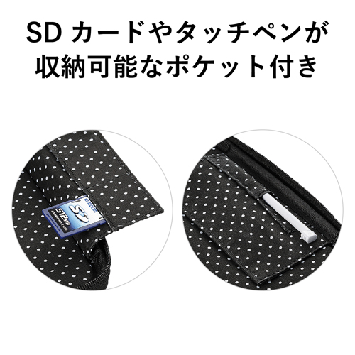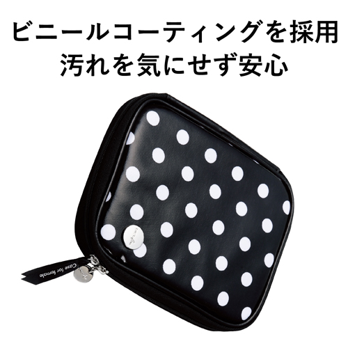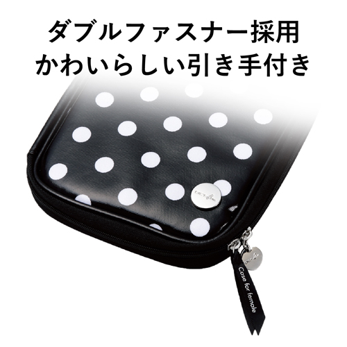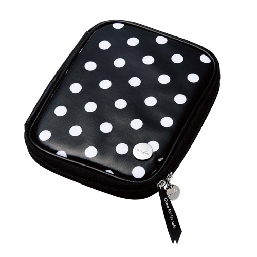 汚れにくいビニールコーティングタイプの電子辞書ケース“DICT.fem”です。 ケース外側には少し大きめの、内側には小さめの水玉柄をあしらい、キュートなデザインに仕上げています。 ダブルファスナーを採用していますので、電子辞書本体を容易に出し入れ可能です。 引き手にはカワイイシルバープレートとリボンが付いています。 メディアカードやちょっとしたメモなどを収納できるインナーポケットが付いています。 インナーポケット表面には、タッチペンを差し込んで収納できるタッチペンポケットが付いています。 付属の粘着シートで電子辞書本体をケースにしっかりと固定できます。貼り直しも可能です。