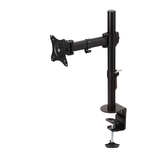 13インチから27インチの液晶ディスプレイに対応した液晶ディスプレイ用アームです。 液晶ディスプレイ下のスペースを有効活用してデスクの上を広く使うことができます。 液晶ディスプレイの位置を自由に動かして調整できるのでベストポジションにセットできます。 液晶ディスプレイを1台設置できるシングルアームタイプです。 取り回ししやすい3軸可動のショートアームタイプです。 VESA規格(75×75mm、100×100mm)に準拠した液晶ディスプレイに対応しています。 グロメット式とクランプ式の両対応なので取り付ける机に合わせて選べます。 アーム固定部分はレバー式のネジですので、簡単に高さ調整や固定することができます。 液晶ディスプレイからのケーブルをすっきりまとめる事ができるケーブルホルダー付 付属の六角レンチは、ポール用ケーブルホルダーに掛けて保管できます。 仕様: ●対応サイズ:13~27インチ ●取り付け画面数:1画面 ●固定方式:クランプ式/グロメット式 ●軸数:3軸 ●ガススプリング:- ●耐荷重:8.0kg ●対応規格:VESA規格(75×75/100×100mm) ●可動範囲:パン:左90°/右90°、チルト:上45°/下45°、ローテーション:360° ●取り付け可能天板厚:10~88mm ●寸法:約幅325×奥行115×高さ580mm ●質量:約2.6kg ●色:ブラック ●セット内容:アーム×1、 ポール×1、クランプ×1、グロメット用上プレート×1、グロメット用下プレート×1、ポール用ケーブルホルダー×1、クッションパッド×5、六角レンチ(5mm)×1、六角レンチ(6mm)×1、M4ネジ×4、M5ネジ×4、サラネジ×1、ワッシャー×4、取扱説明書×1