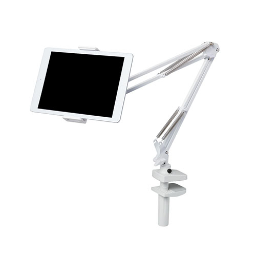 長いフレキシブルアームとボールジョイントでタブレットを自在に位置調整できるフレキシブルアームスタンドです。 タブレットをしっかり固定し自在に位置調整できるため、デスクやベッドサイドでの使用に最適です。 およそ5.0~12.9インチのスマートフォン、タブレットに対応しています。 フレキシブルアームで、機器本体との距離や高さを好きな位置に調整して使用できます。 タブレットホルダーの接続部分にボールジョイントを採用しているので、角度や向きを自由に調節できます。 ベースホルダーは簡単に取り付け可能なクランプ式です。 仕様: ●材質:本体:ABS+熱可塑性エラストマー、スチール、ポリアセタール ●外形寸法:アーム部全長:約700mm ●重量:約600g ●カラー:ホワイト ●対応機種:ディスプレイサイズが5インチ以上12.9インチ以下のスマートフォン、タブレットPC ●角度調節:○