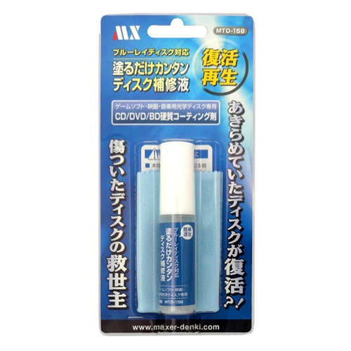 ・ブルーレイディスクにも対応したディスク補修液です。 ・音飛びや映像の乱れとなるミクロのキズまで入り込み短時間でキズを修復します。 ・塗るだけカンタン ブルーレイ、DVD、CDなどのディスクメディアでご利用いただけます。 ・当商品は研磨剤ではなく「ディスクの傷に塗り込んで埋める」補修剤となります。 ・研磨剤では記録面を傷つける場合もありますが、当製品ならその心配もありません。 ・傷の修復以外に傷防止の保護剤としてもご利用いただけます。 ※すべてのキズに有効ではございませんのでご注意ください。 ※液を付けた後は付属のクロスでふき取ってください。ムラがある場合、正常に読み込みができない場合がございます。