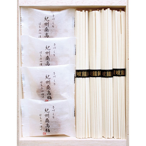 紀州南高梅・讃岐うどん詰合せ(木箱入) B5042107 紀州南高梅・讃岐うどん詰合せ(木箱入) B5042107 (4944861038306) 日本一の梅の里、和歌山の肉厚で皮が柔らかい最高級の紀州南高梅のはちみつ漬けと讃岐うどんの詰合せです。 4944861038306 在庫状態 : 在庫有り ¥1,460(税込) 数量個
