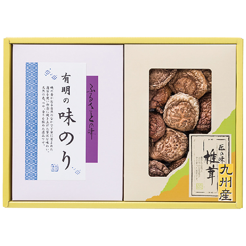 ビタミン豊富で風味豊かな、九州産椎茸と、良質の海苔が採れる事で知られる、有明産海苔を味付加工した、椎茸・味海苔詰合わせです。